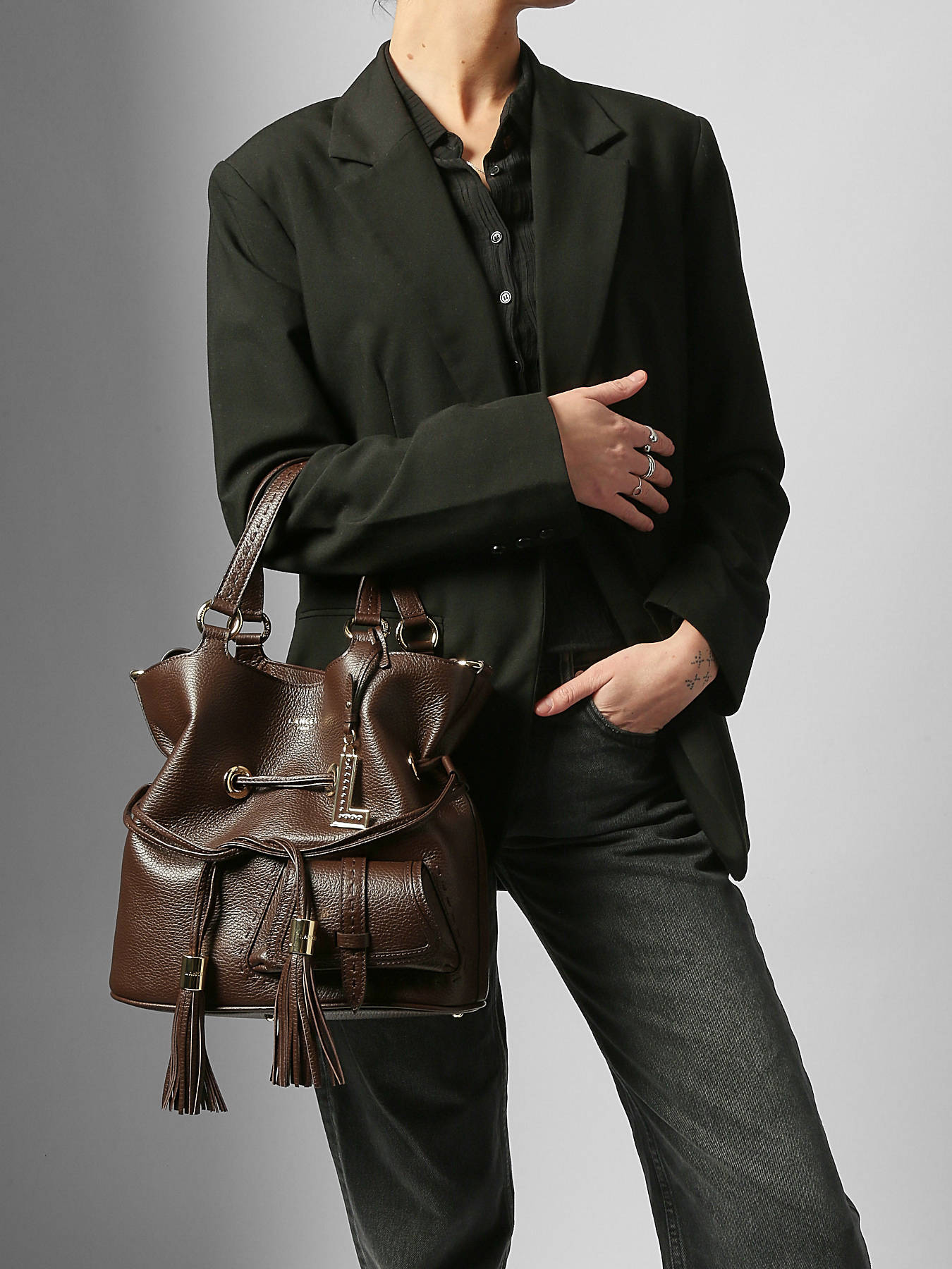 Its chic and elegant look is instantly recognisable thanks to iconic details such as the tasselled drawstring, the metallic L-shaped yoke and the flap pocket on the front.