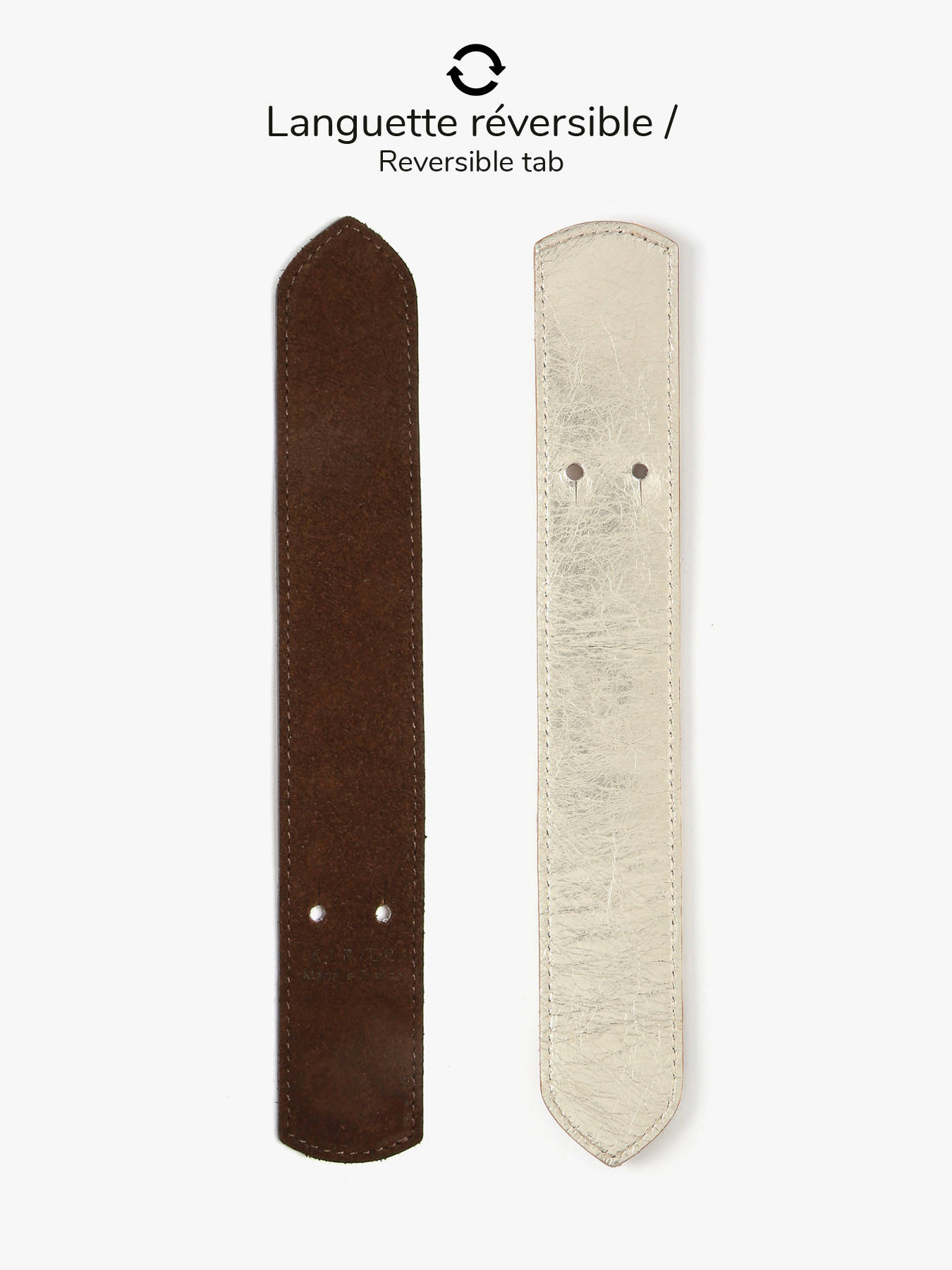 Le logo ETRIER, embossé sur du cuir naturel, est accompagné d'un petit drapeau français, symbole discret du savoir-faire artisanal.