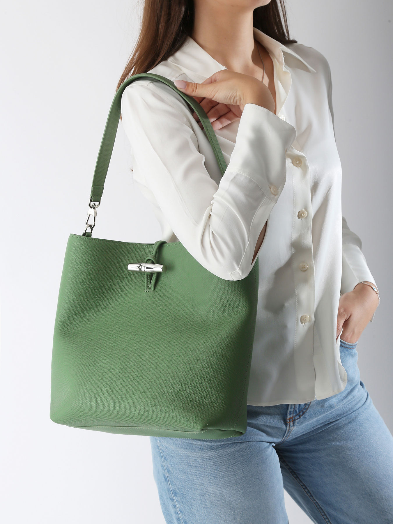 This M-sized shoulder bag crafted from grained cowhide leather combines elegance and practicality with its clean lines and spacious interior designed to hold a 13-inch laptop, a book, and your daily essentials. Its iconic bamboo clasp, a true hallmark of the Roseau line, adds a refined and feminine touch, making this bag both sophisticated and timeless. The supple leather, which develops a beautiful patina over time, highlights Longchamp’s artisanal expertise, making this bag the perfect companion for everyday chic style.
