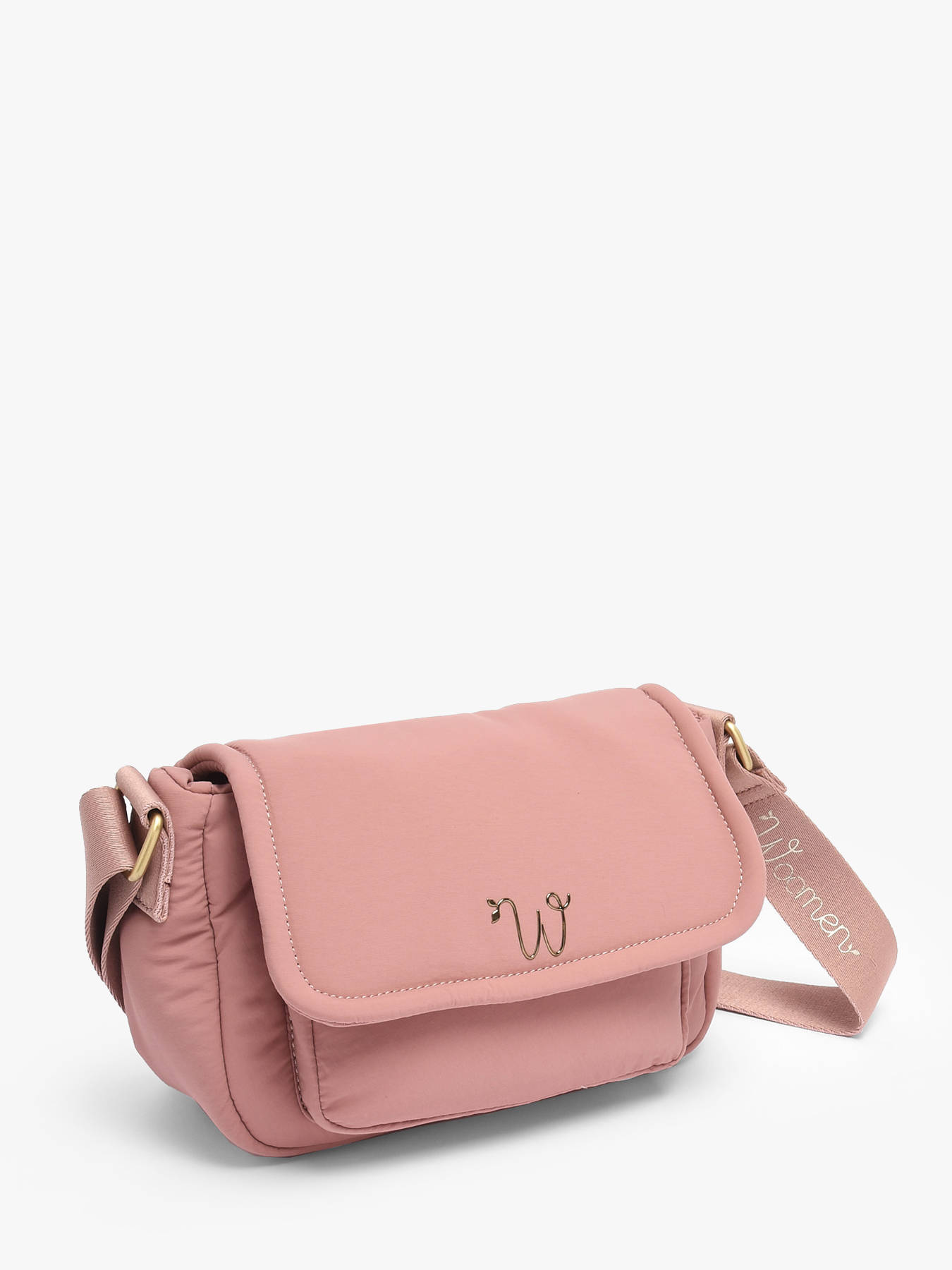 The WOOMEN crossbody bag from the PRIMEVERE line, in a small format, captivates with its magnetic flap, secure zip closures, and multiple pockets, including zipped compartments at the front and back. Made from recycled nylon, it features an adjustable strap for crossbody wear and a cotton and linen-lined interior with two slip pockets, a zipped pocket, and a single main compartment. The golden resin logo and decorative cords add a refined touch.